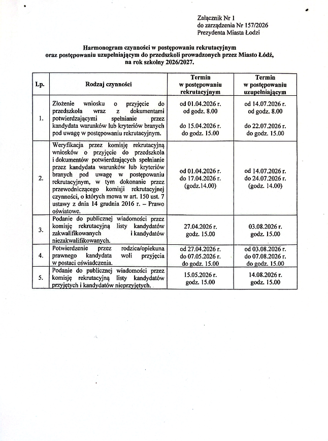 Harmonogram czynności w postępowaniu rekrutacyjnym oraz postępowaniu uzupełniającym do przedszkoli prowadzonych przez Miasto Łódź, na rok szkolny 2026/2027