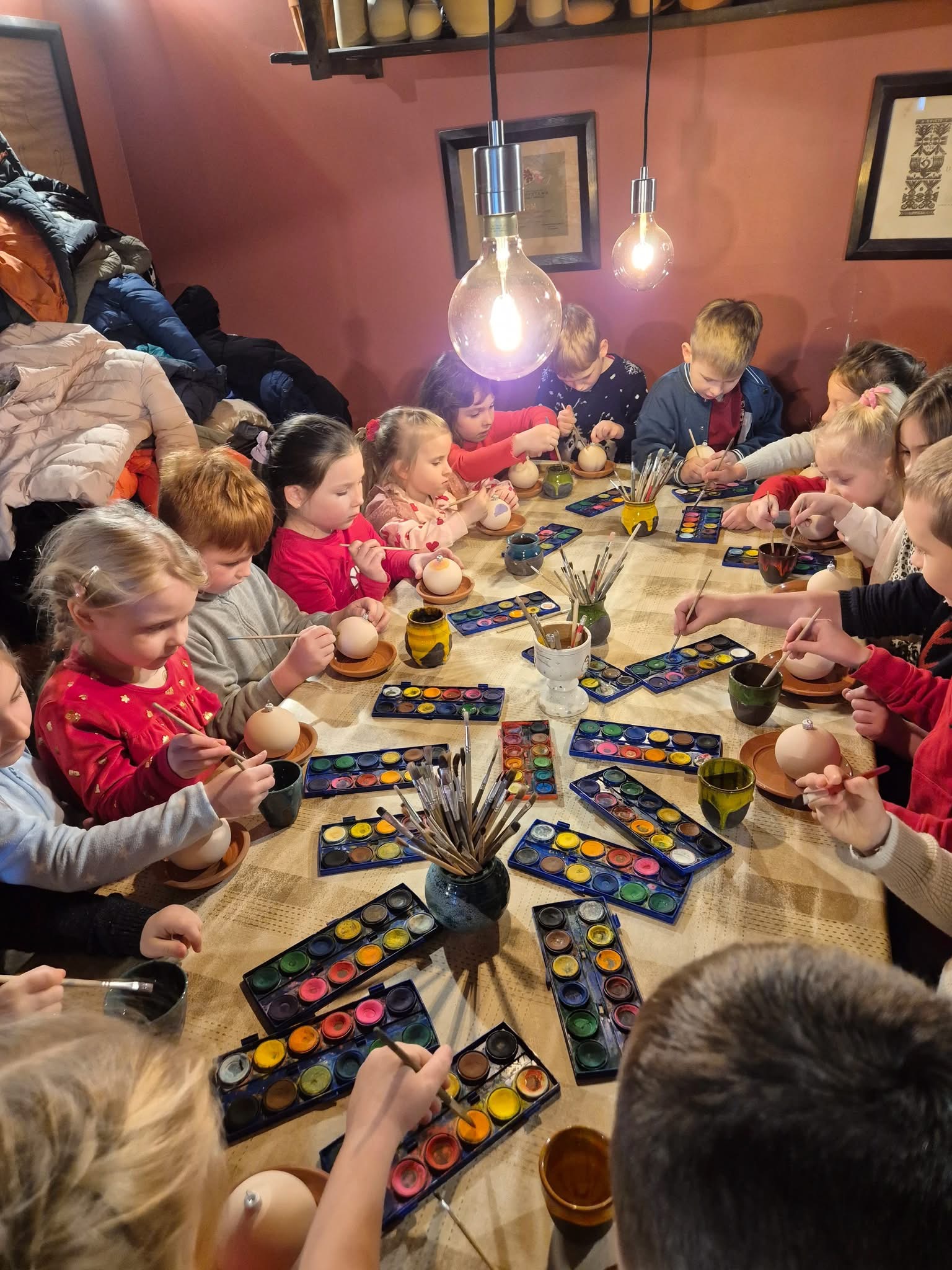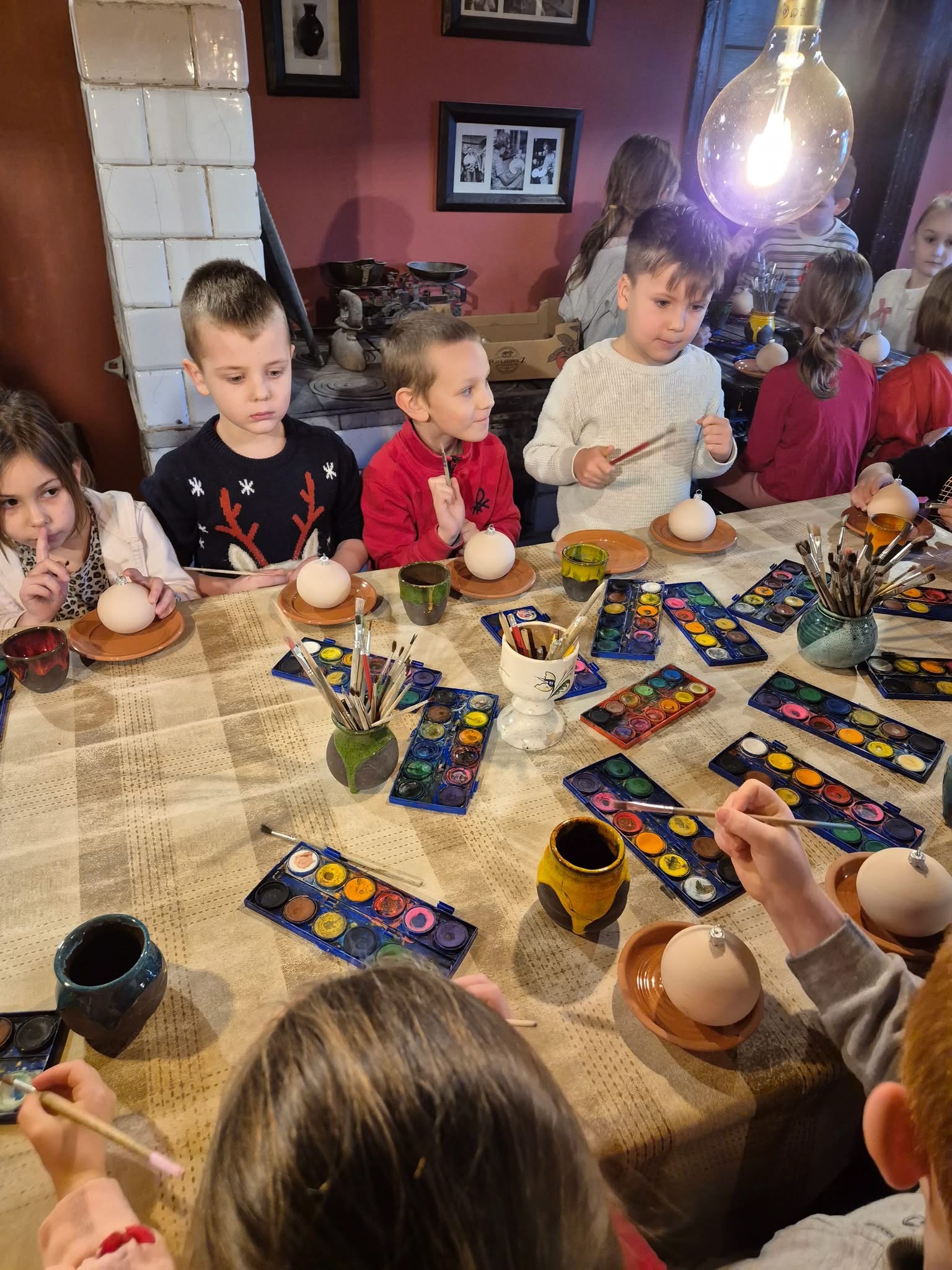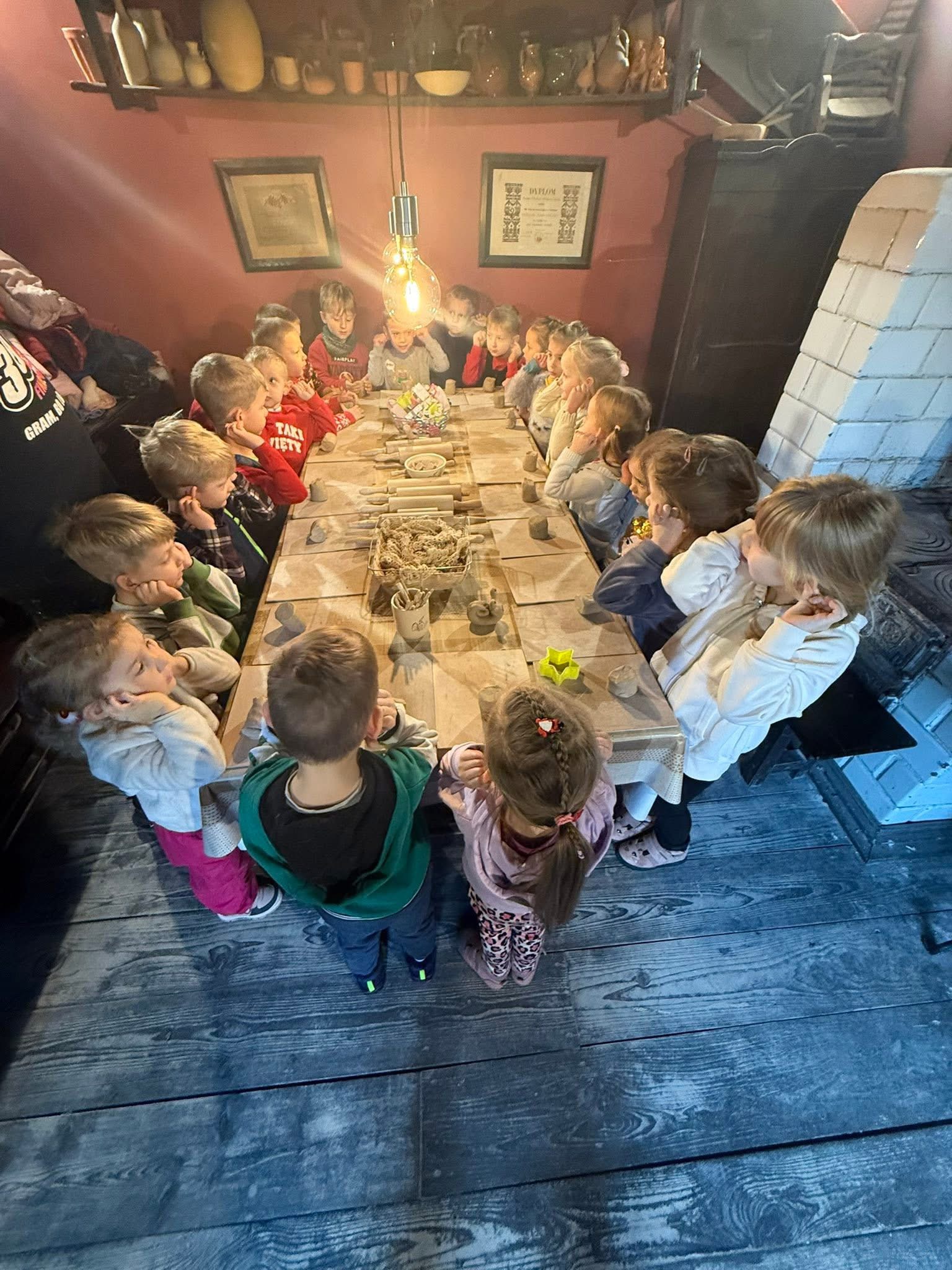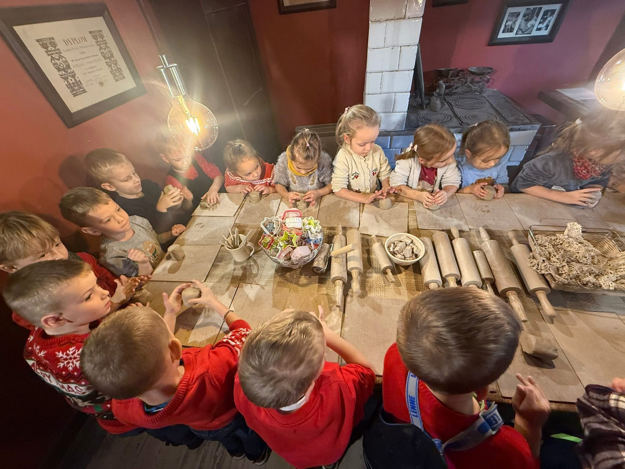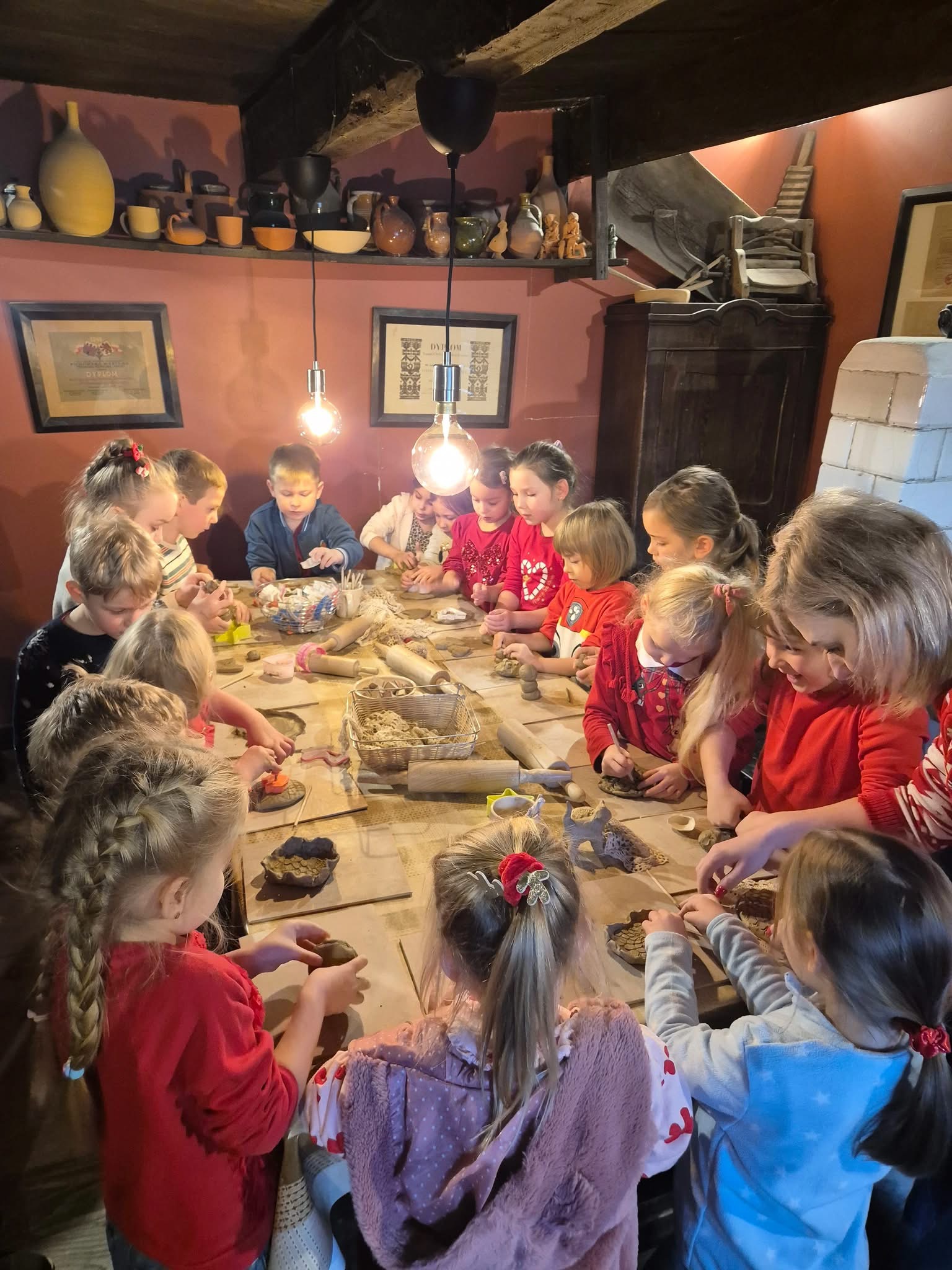 Podczas wycieczki do warsztatu garncarskiego rodziny Konopczyńskich w Bolimowie dzieci miały okazję poznać fascynujący świat tradycyjnego garncarstwa. Przedszkolaki z zaciekawieniem obserwowały, jak z kawałka gliny powstają piękne naczynia – miski, dzbanki i kubki – a pan garncarz opowiadał o swojej pracy i rodzinnych tradycjach przekazywanych z pokolenia na pokolenie.